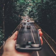 forced perspective photography of cars running on road below smartphone